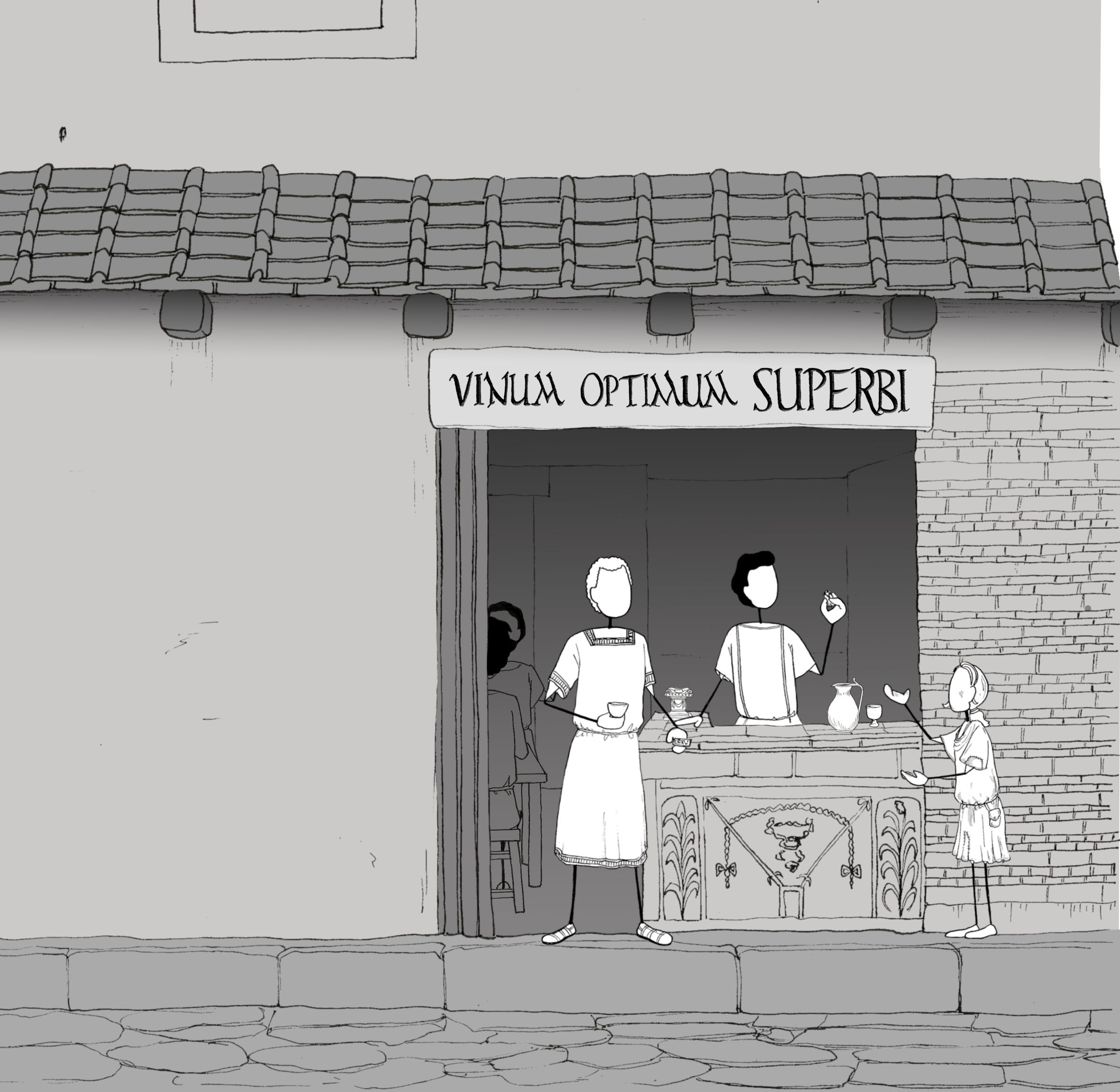 The wine bar should be closed for Saturnalia like other businesses, but the owner, Superbus, is offering free drinks to regular customers and she can hear happy chatter coming from the drinking room. Superbus himself is eating a sausage in a vine- leaf wrapper and chatting across the polished marble counter to his friend Mestrius, who is standing on the pavement. Everyone in Pompeii knows Superbus loves to gamble and Sophe hopes she might get a reward for this news.