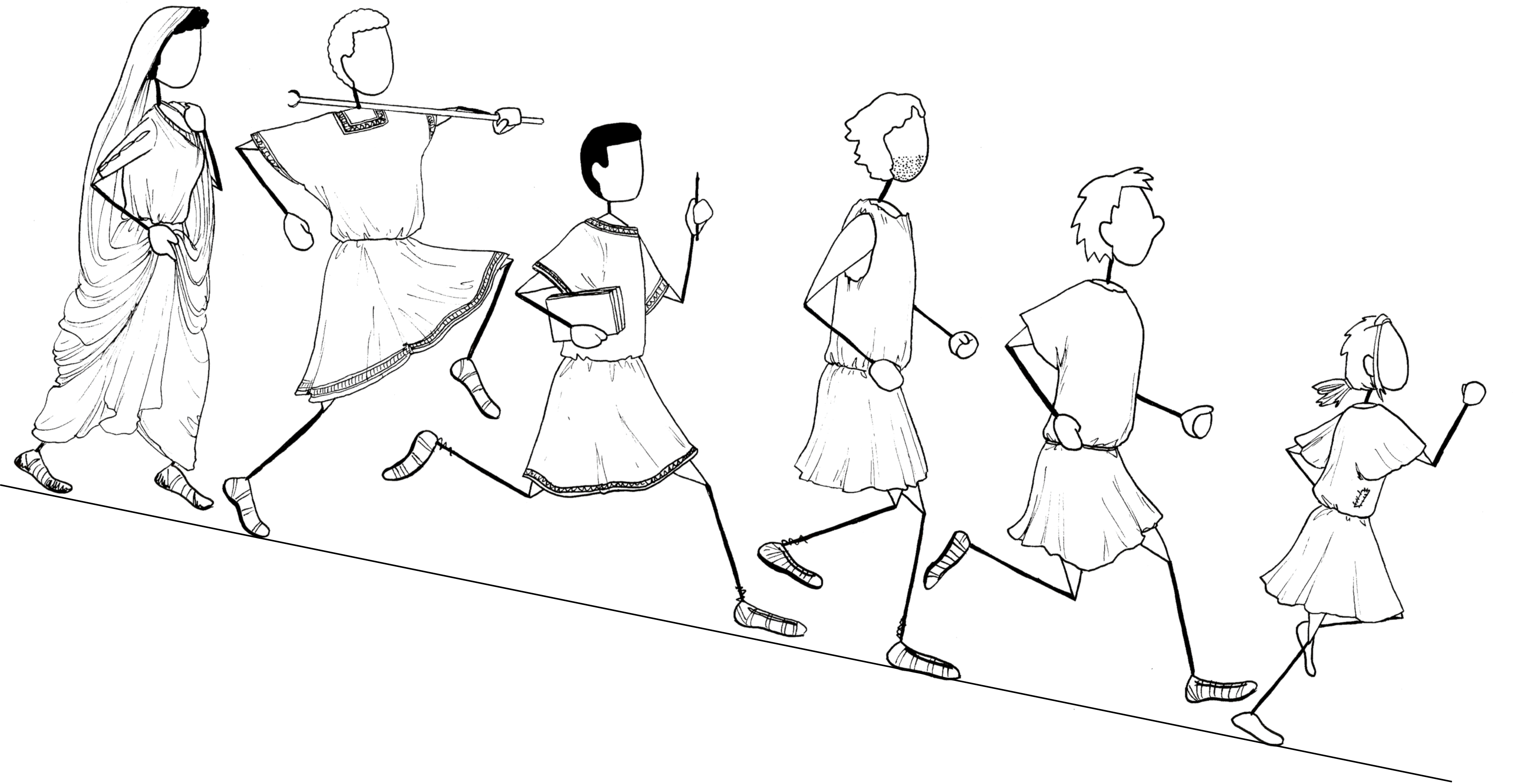 ‘Don’t go!’ cries Pompeia. She has just spotted someone coming through the gate: a young man with big ears and a toga, accompanied by a woman and two slaves. ‘I know that man. He’s a citizen.’ She flaps her palla and calls out, ‘Lucius!’ ‘Pompeia,’ he says, coming over. ‘How are you? I was sorry to hear you lost your son in the earthquake.’ ‘Thank you,’ she says. ‘It would have been worse but my slave Amarantus saved our lives by making the rest of us stay in the open. I’ve asked this kind magistrate to witness his manumission, but we need one more witness. Can you spare a few moments?’ ‘Of course,’ he says, and to his wife, ‘Metella, my dear, wait by that fountain? I’ll only be a few moments.’ ‘Oh, you have a wife and a baby!’ cries Pompeia. ‘Yes,’ says Metella, coming closer and proudly showing the baby in her arms. ‘His name is Quintus.’ ‘No time for that now,’ huffs the plump magistrate. Pompeia gives Metella a warm smile. ‘Come to my house for a cup of mulsum one afternoon and we’ll catch up on news.’ Then she turns her attention to the magistrate. There is just enough room inside the town gate for Pompeia and the men to stand in a semi-circle around the litter. At this moment Grata arrives, obviously near tears. Pompeia gives her a reassuring smile and points at the big-eared young man as if to say ‘We found a witness!’ |