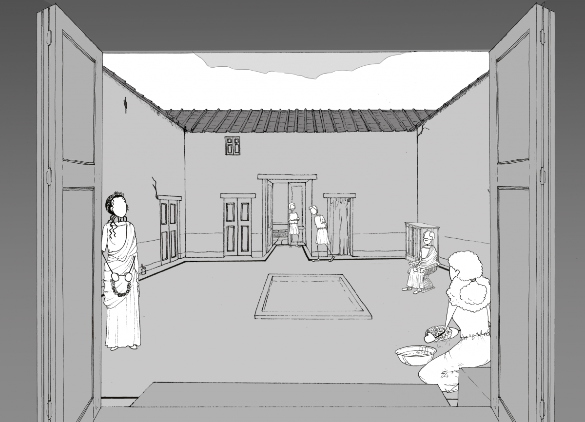 Grata kneels on the floor of the atrium by a plaster-lined basin that was once a cistern. She is waiting to wash the feet of the next man who comes through the door. Today is her master’s birthday. Old Camillus sits in a chair near the mock impluvium, waiting to greet each guest. Beside him stands a big wooden chest displaying his gifts. From her position at the end of the atrium, she can see three other people apart from her master. Straight ahead is the grumpy porter Scumnicolus whom she calls Scumni. He is a fellow Briton and his job is to guard the threshold of the house. The head slave, Amarantus, paces in the shadows of the entryway, waiting to greet each guest and announce them. And there is Camillus’s beautiful granddaughter Fabia. She stands a few paces to Grata’s left. Her duty is to place a fragrant garland on the head of each guest, after their feet have been washed, and then point the way to the inner garden. |