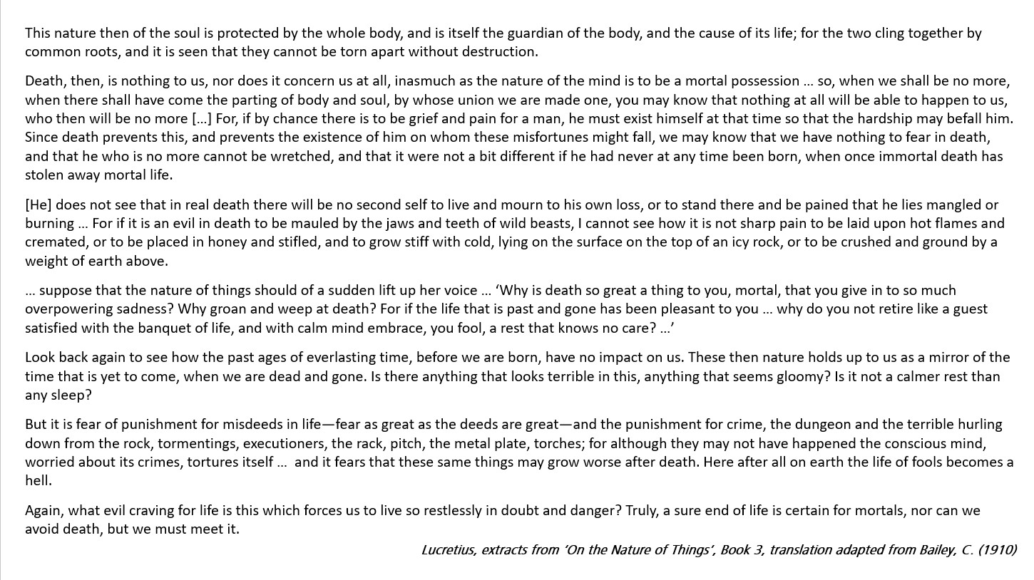 Lucretius was a poet with a great interest in a school of philosophy called Epicureanism. Epicureanism was a popular school of philosophy in the Roman world, but it never entered the political 'mainstream'. Lucretius' great work On the Nature of Things is a long poem which explains Epicurean philosophy, including its beliefs about the soul and death. Epicureans believed that the soul and body were united in life, but one could not exist without the other. When the body dies, the soul also dies and is no more. Epicureans say, therefore, that fearing death or worrying about 'what comes next' is pointless; we will not be aware of anything after death so why worry about it? Lucretius suggests in his poem that fear of punishment after death in an Underworld is actually people worrying about things in their lives, and creating symbols of this after death. Lucretius and the Epicureans believed that people should make the most of their one life and not waste time worrying about death and what happens afterwards.