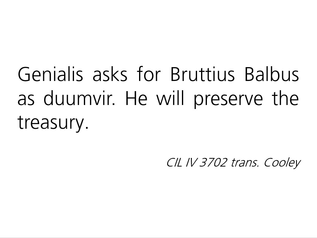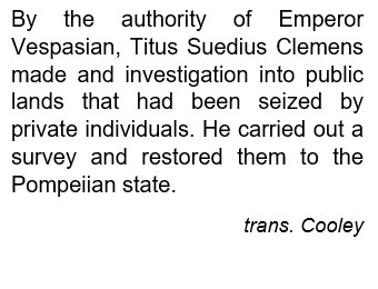 In AD 69 the Emperor Vespasian took control of the Empire after a period of unrest, and strengthening the Empire’s financial position was a priority. He dispatched an agent, Titus Suedius Clemens, to Pompeii to survey public land which had been taken over by private individuals and restore them to the Pompeian state (and therefore the Empire). Multiple copies of an inscription documenting Suedius Clemen’s work were set up as boundary markers between land owned by the town of Pompeii, and the surrounding countryside.