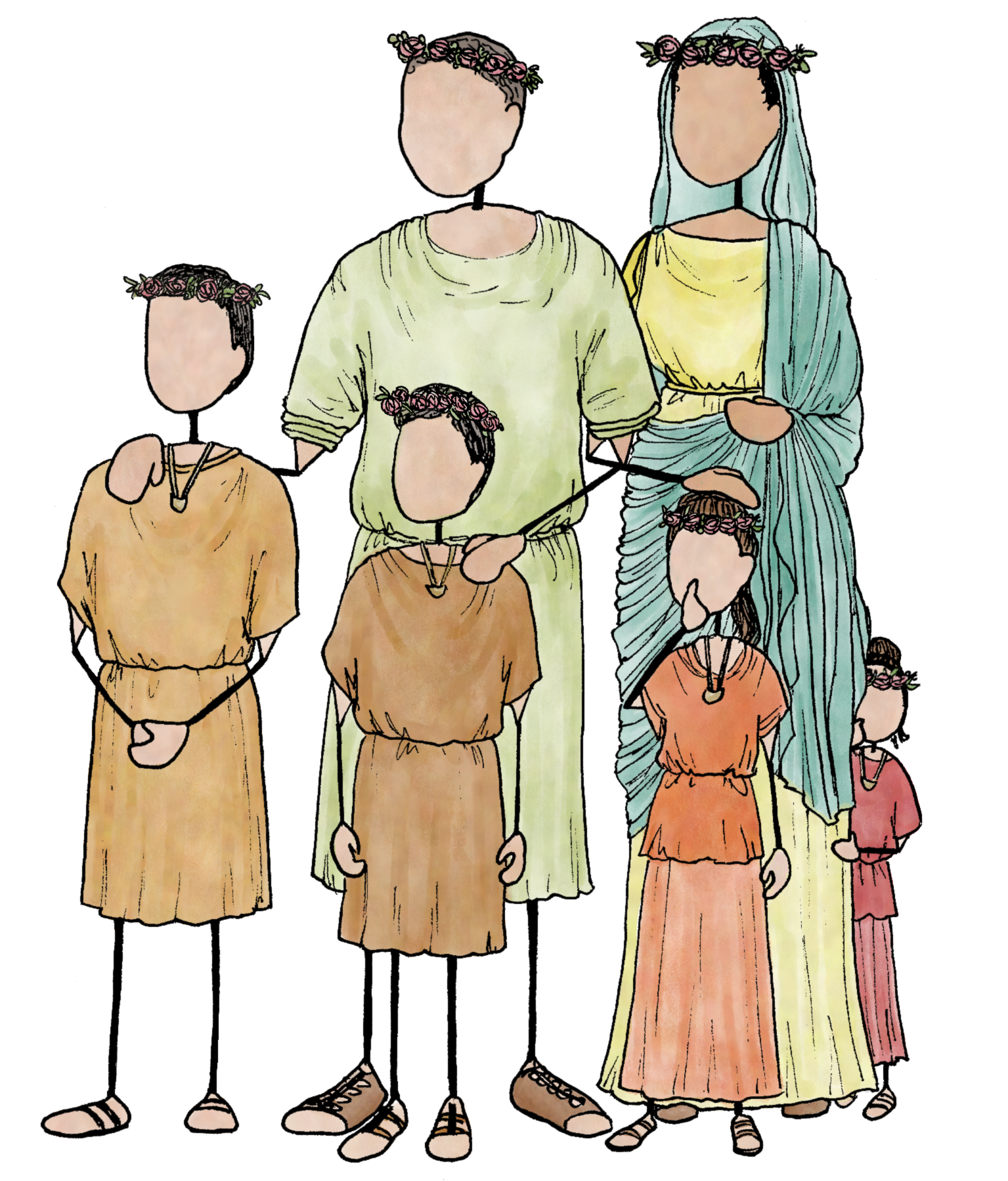Two of the barber’s youngest children snuggle up either side of plump Valeria Volusa, fast asleep. Vatia and his Egyptian wife are lying close together on a bedspread covered rush mat.